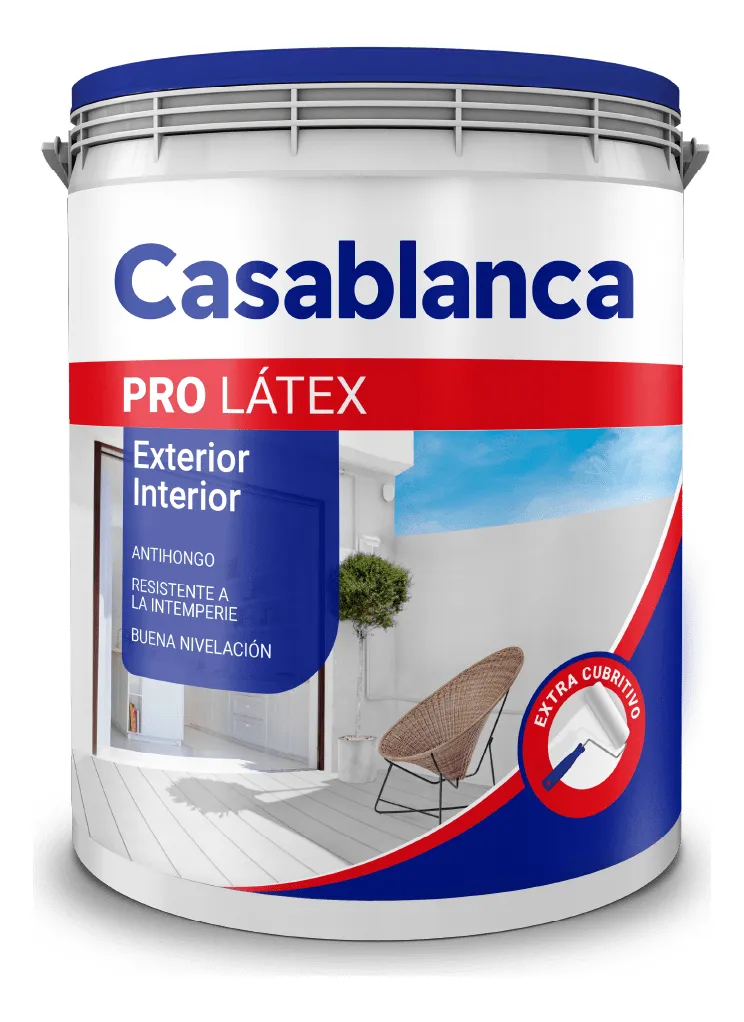 LÁTEX CASABLANCA PRO INTERIOR / EXTERIOR 1 LITRO Es un recubrimiento látex acrílico de excelente poder cubritivo, lavable y antihongo, recomendado para proteger y decorar ambientes interiores y exteriores. Desarrollado con materias primas de alta tecnología, que otorgan gran durabilidad y resistencia. Acabado: Mate. Aplicación: Revoque, mampostería, ladrillo y cemento. Importante: Para obtenerse lo máximo de la calidad de los productos Casablanca se hace necesario una buena preparación de la superficie a aplicarse.